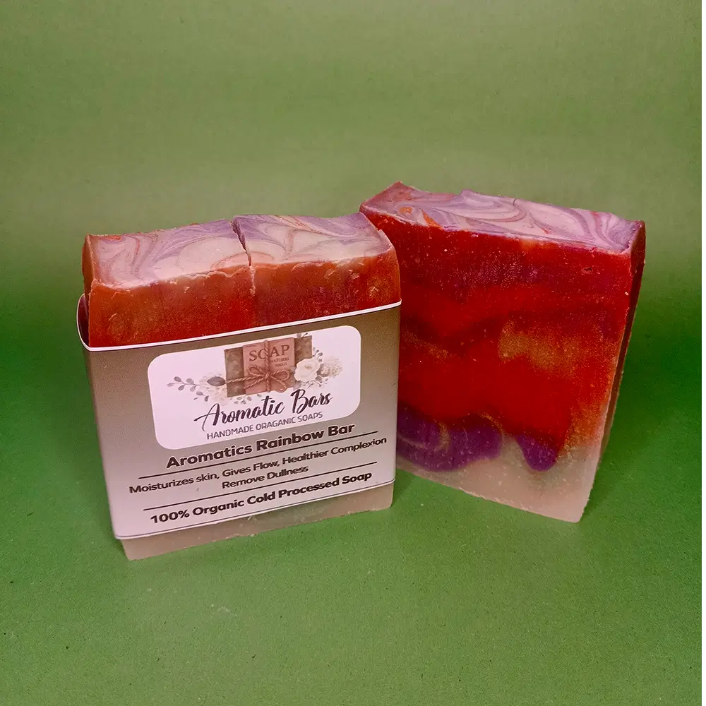 Bring life back to your skin with our Aromatics Rainbow Bar, a 100% organic cold-processed soap. This soap moisturizes, removes dullness, and promotes a healthier, radiant complexion for all skin types.